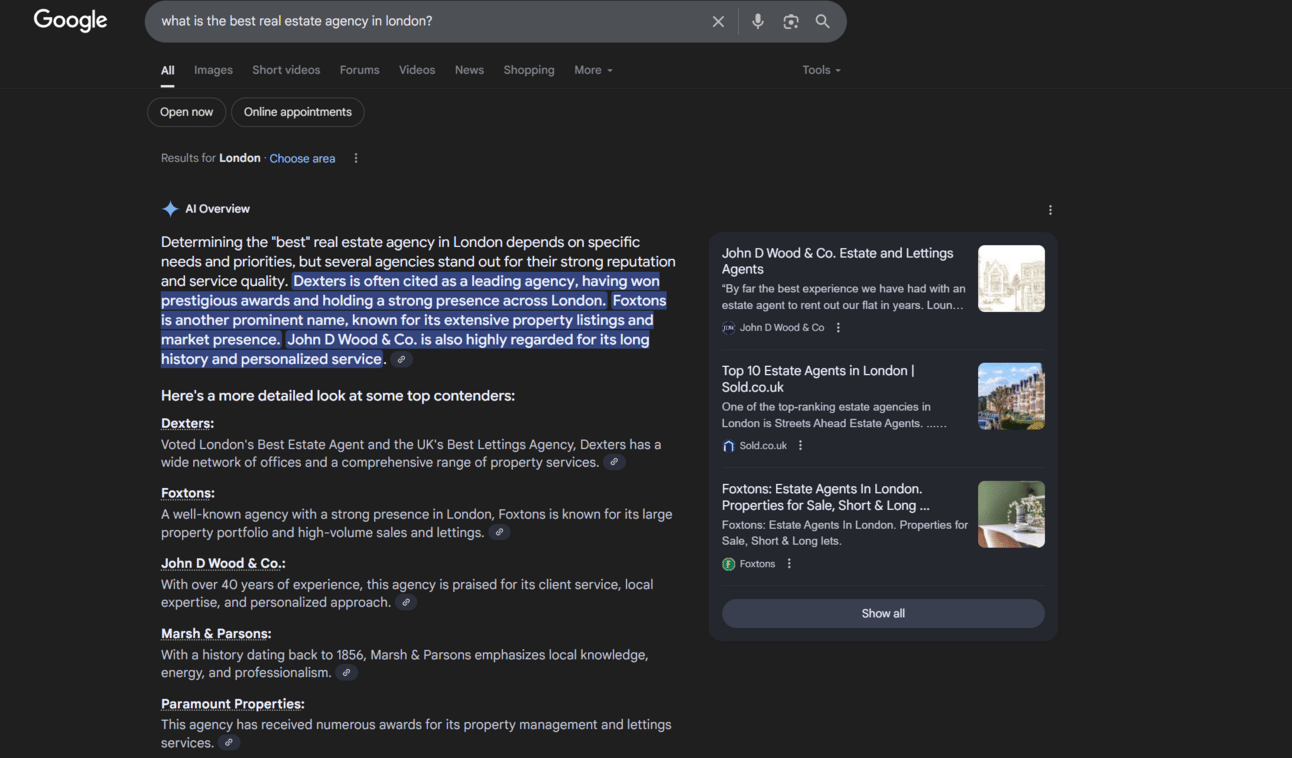 In order to avoid being buried, you need to ensure your real estate agency website is optimised for LLM crawl and search. This means, whenever someone uses an LLM like ChatGPT to search, the data scraping agent can easily crawl and extract key information from your website and provide your company as a source.
